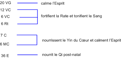 Principe thérapeutique : fortifier la Rate, nourrir le Cœur, tonifier le Qi et le Sang